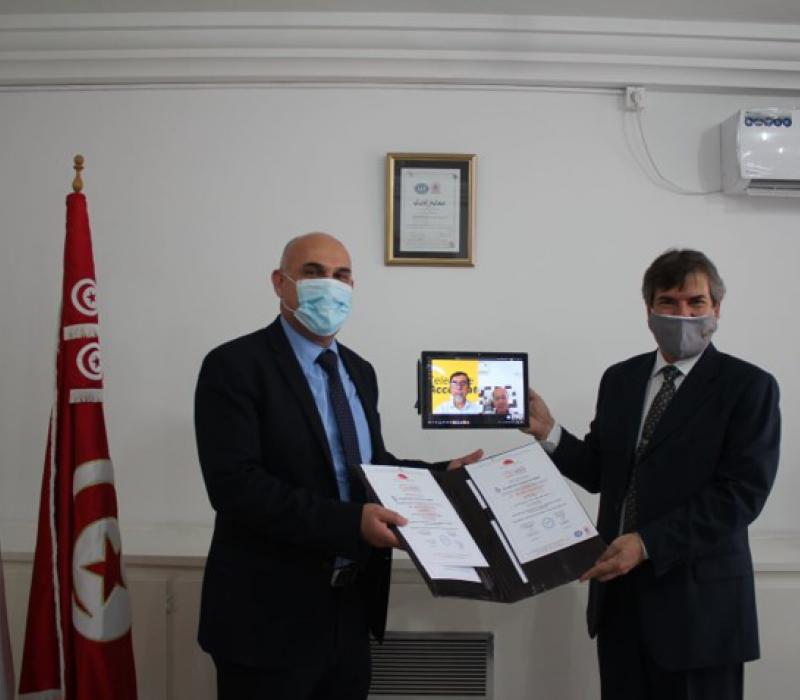 Cette cérémonie a été marquée par une conversation vidéo en ligne entre le Directeur Général de l’INNORPI M. Riadh SOUSSI et le PDG de la SCG M. Sergio MARTINS de son bureau au Portugal qui ont exprimé leur volonté pour s’étendre vers d’autres horizons de collaboration et de partenariat tel que le transfert technologique.