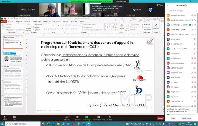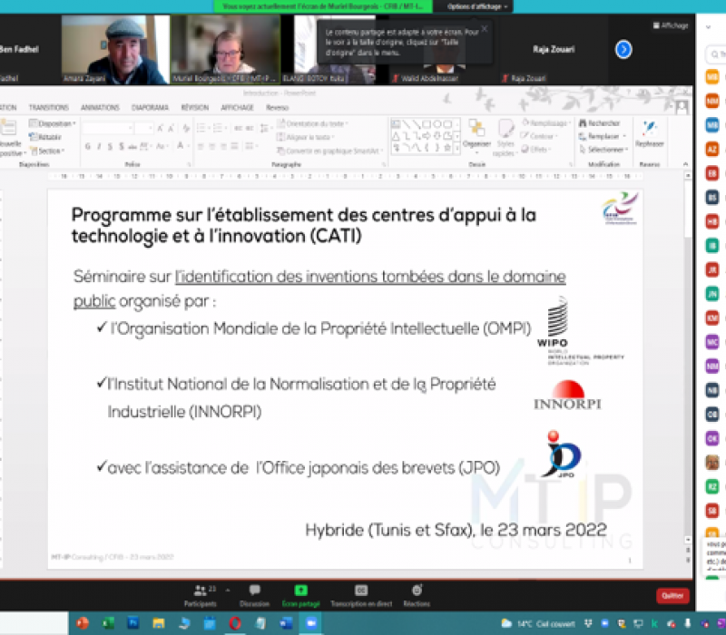 Dans le cadre du programme de l’OMPI sur l’établissement des Centres d’appui à la technologie et à l’innovation (CATI), l’Institut National de la Normalisation et de la Propriété Industrielle (INNORPI), l’Organisation Mondiale de la Propriété Intellectuelle (OMPI) et l’Office japonais des brevets (JPO) ont organisé, le mercredi 23 mars 2022, un séminaire virtuel sur « L’identification des inventions tombées dans le domaine public ».